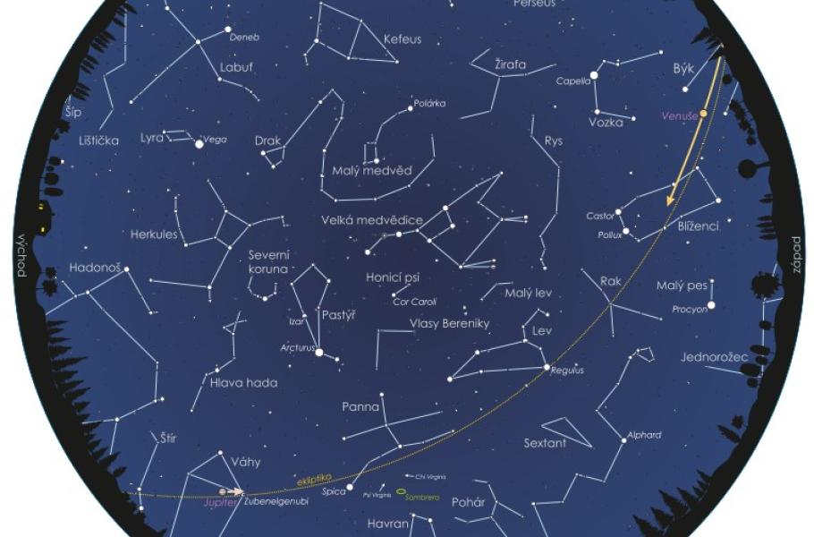 Květnové večerní nebe zkrášlují dvě velmi nápadné planety. Zatímco první vychází nad jihovýchodní obzor, druhá stejným tempem klesá k severozápadu. Přibližně o půl desáté večer se však jejich pozice na obloze nakrátko vyrovnají a obě budou ve stejné úhlové výšce nad příslušnou částí horizontu. Při letmém pohledu vypadají v podstatě stejně, pozornější srovnání však ukáže, že planeta nad západem je přece jen o něco jasnější. A má i mírně odlišný odstín.