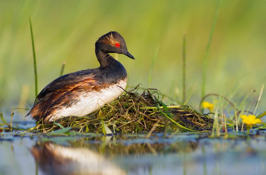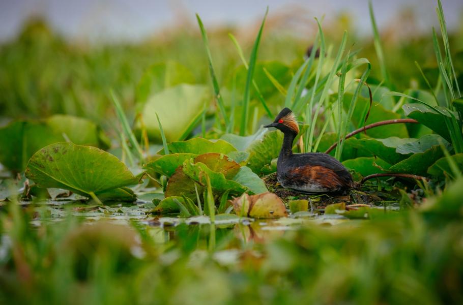 Hnízdo potápky černokrké bývá většinou postaveno daleko od břehu. V podstatě jde o malý plovoucí ostrov