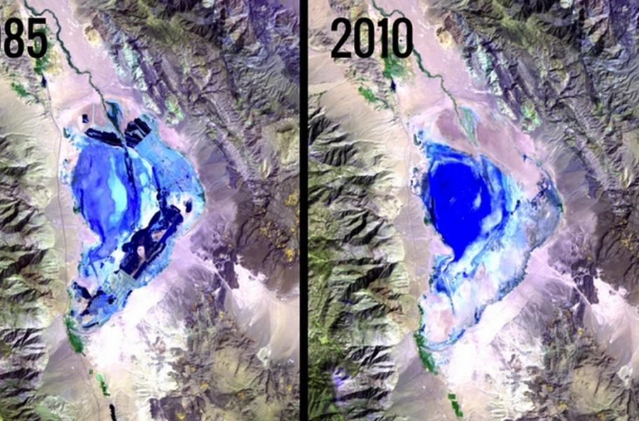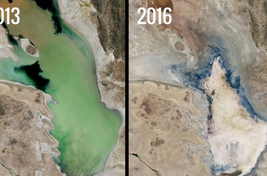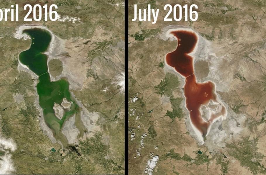 Urmijské jezero na severozápadě Íránu. Každoročně v době letních veder jezero mění svou barvu ze zelené na hnědočervenou. Změna je způsobena odpařováním vody a působením řas a baterií. Údaje ze satelitů ukazují, že za posledních 14 let ztratilo jezero okolo 70 % své původní plochy.