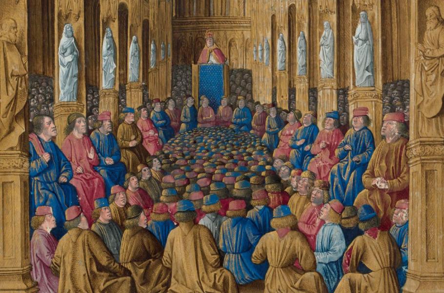 Koncil v Clermontu. Papež Urban II. zde využil první kruciátu k vlastnímu zviditelnění.