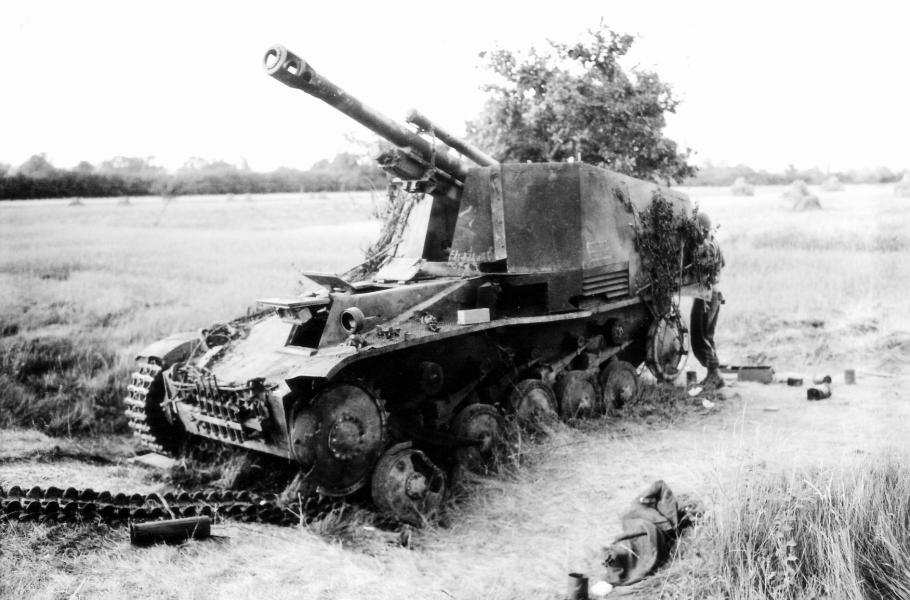 Samohybná houfnice Wespe zničená v Normandii. Armáda ji nakonec upřednostnila před Geschützwagenem Ivb für 10,5-cm leFH 18/1. (foto: Wikimedia Commons, W.wolny, CC0)