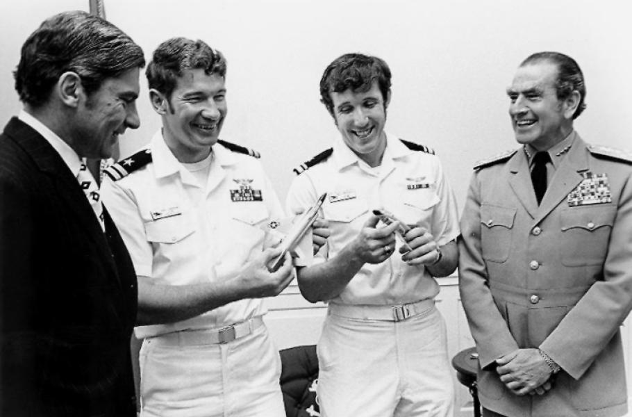 Poručík Cunningham (druhý zleva) a poručík William P. Driscoll (třetí zleva), jediná dvě letecká esa amerického námořnictva ve válce ve Vietnamu. (foto: Wikimedia Commons, U.S. Navy, CC0)
