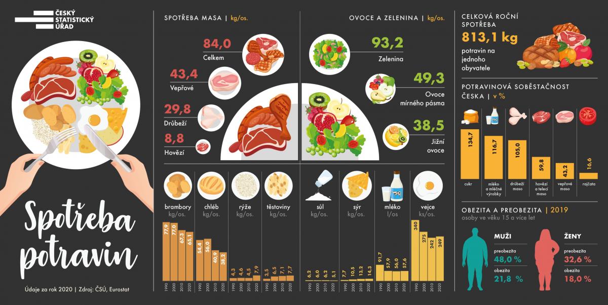 Podle čerstvé zprávy Českého statistického úřadu spořádá každý Čech v průměru 813 kilogramů potravin. Významnou položku českého jídelníčku tvoří maso – ročně ho průměrně sníme 84 kilogramů (50 % vepřové, 35 % drůbeží). Spotřeba masa je tak vyšší než v roce 2016 (80,3 kg). Pro srovnání – v roce 1950 se v tehdejším Československu spotřebovalo průměrně 48,6 kg masa na hlavu a v roce 1936 to bylo ještě o 10 kilogramů méně.