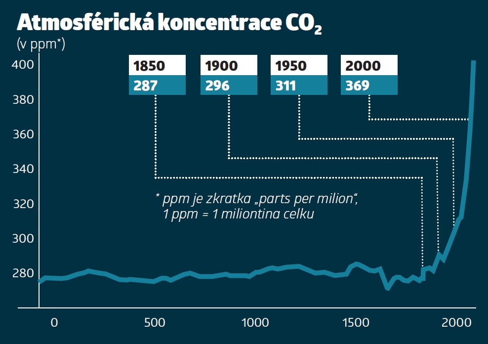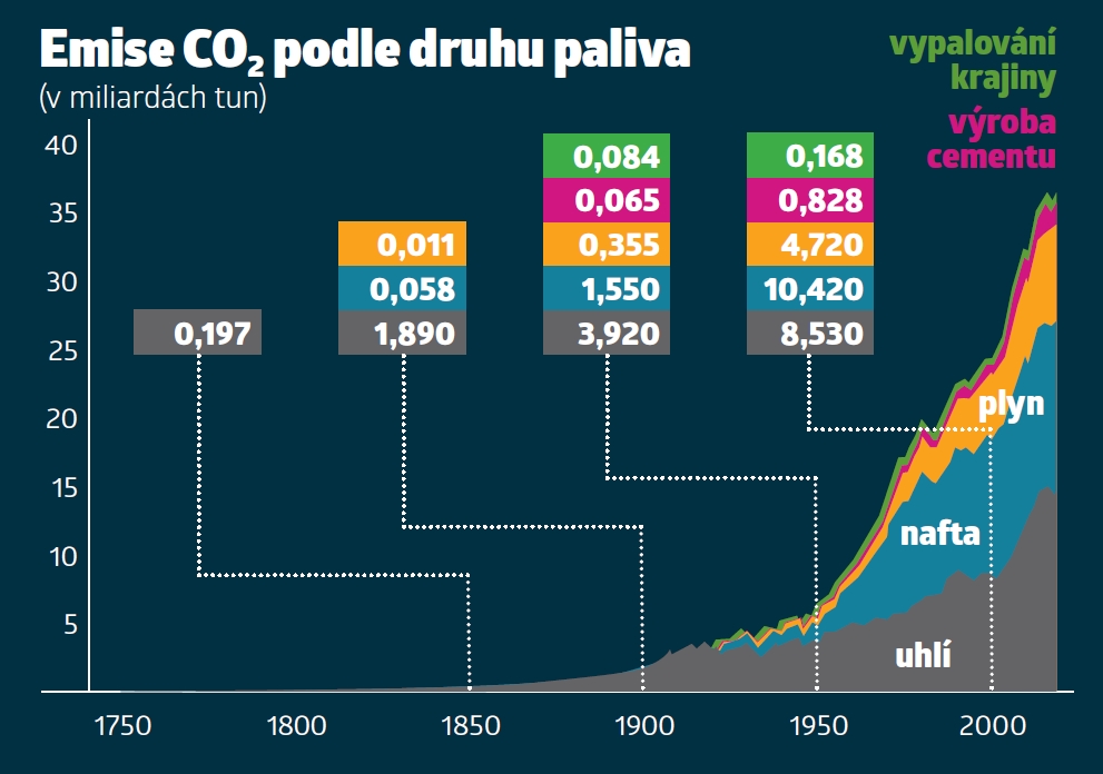 Z dlouhodobého hlediska však změny v ovlivňování ovzduší přišly pozdě: Agresivní růst průmyslu a spalování měly za následek extrémní produkci skleníkových plynů v čele s oxidem uhličitým. Podle analytického webu Global Carbon Project vyprodukovala Velká Británie v letech 1750–2016 celkem 77 miliard tun CO2, Rusko 100 miliard, Čína 200 miliard a Spojené státy bezkonkurenčních 399 miliard. Pro srovnání, u nás šlo za stejnou dobu o „pouhých“ 8,32 miliardy tun. Největší podíl na uvedeném znečištění mělo samozřejmě uhlí, nicméně v první polovině 20. století začaly vzduch víc negativně ovlivňovat i ropné produkty.
