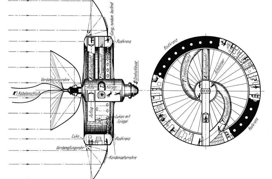 O pilotovaných kosmických základnách se zmiňoval už na přelomu 19. a 20. století ruský teoretik Konstantin Ciolkovskij. Reálnější návrh velké družicové stanice pak v roce 1923 zveřejnil Němec Hermann Oberth. Uvažoval o jejím využití zejména k astronomickým pozorováním, zabýval se také otázkou ochrany posádky a přístrojů před meteoroidy. Vesmírným příbytkům se věnoval rovněž Herman Potočnik ze Slovinska, který v roce 1929 jako první navrhl vytvoření umělé tíže na palubě: V kruhovém objektu o průměru 30 m by přitažlivost vytvářela rotace rychlostí osm otáček za minutu.
