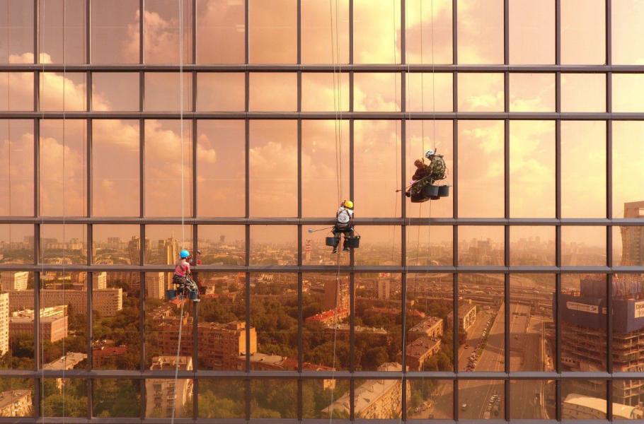 Umývači oken na stěně Mercury City Tower v Moskvě.