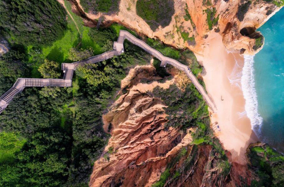 Dlouhé schodiště vedoucí k pláži v Algarve, Portugalsko.