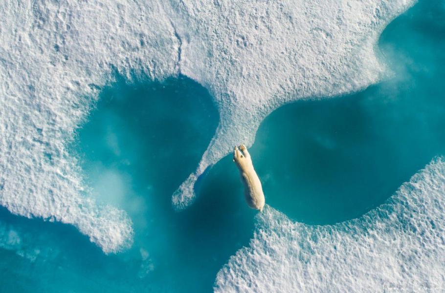 Polární medvěd se přesouvá z jedné kry na druhou, Kanada.