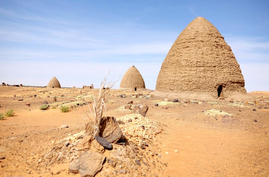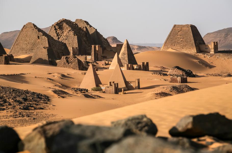 V Súdánu se dochovala rozsáhlá pyramidová pole: Největší leží u dnešního města Meroe a čítá tři skupiny celkem 352 hrobek, z toho 50 královských. Ubytovat se můžete v luxusním hotelu s výhledem přímo na starověké pohřebiště, nebo si v nenáročné variantě nedaleko rozbít stan. Jde patrně o jedno z mála míst, kde potkáte turisty – Meroe leží jen několik hodin jízdy od Chartúmu a Súdánci o svátcích rádi míří na výlety za minulostí. Skupiny místních, kteří vyrazili na piknik, spolu s nepříliš usilovnými prodejci suvenýrů dotvářejí kolorit špičatých, ostrých a ve srovnání s egyptskými příbuznými vlastně drobných hrobek.