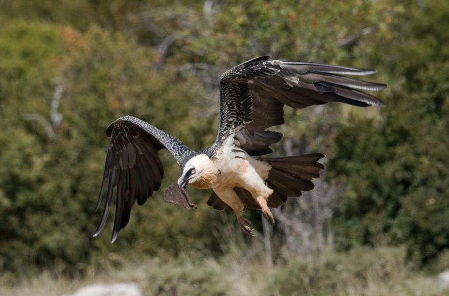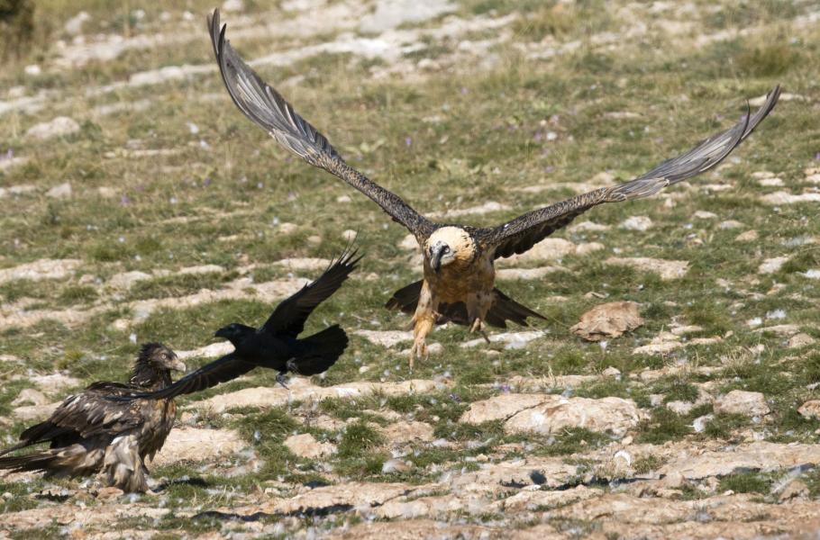 Zhruba po půl hodině, kdy už většina potravy zmizela v žaludcích supů, mnou projede příjemné mrazení. Nad plání se objevuje charakteristická silueta s úzkými křídly a dlouhým, klínovitým ocasem. Pták několikrát zakrouží a nakonec usedne na protější straně krmiště. Popadne do zobáku kus kosti a bez ohledu na značnou velikost sousta jej naráz spolkne. Podle převážně černého zbarvení jde o mladého jedince. Za chvíli se objevují další orlosupi včetně dospělých, celkem se jich během dne vystřídá na planině víc než deset. Je fascinující, jak velké nebo spíš neskladné kosti do sebe dokážou nasoukat.