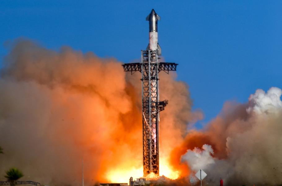 Start Starship Super Heavy z texaské základny Starbase. (foto: Profimedia, AFP/Candan Khana)
