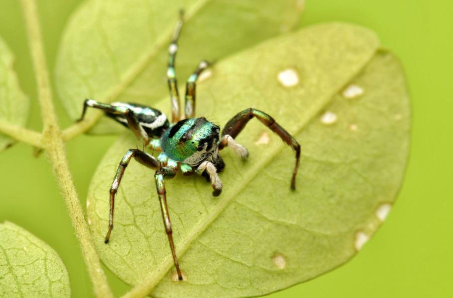 Skákavky mají pozoruhodný styl lovu. Ke kořisti se opatrně „připlíží“ a skokem, který je až 30krát delší než je velikost jejich těla, nic netušící oběť dostihnou. Na snímku je skákavka královská (Phidippus regius), jejíž lov byl právě zakončen úspěchem. (foto: Shutterstock)