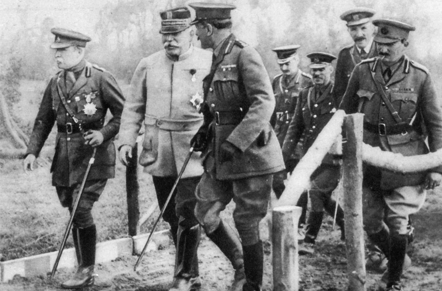 Zleva John French, Joseph Joffre a Douglas Haig během návštěvy frontové linie v roce 1915.