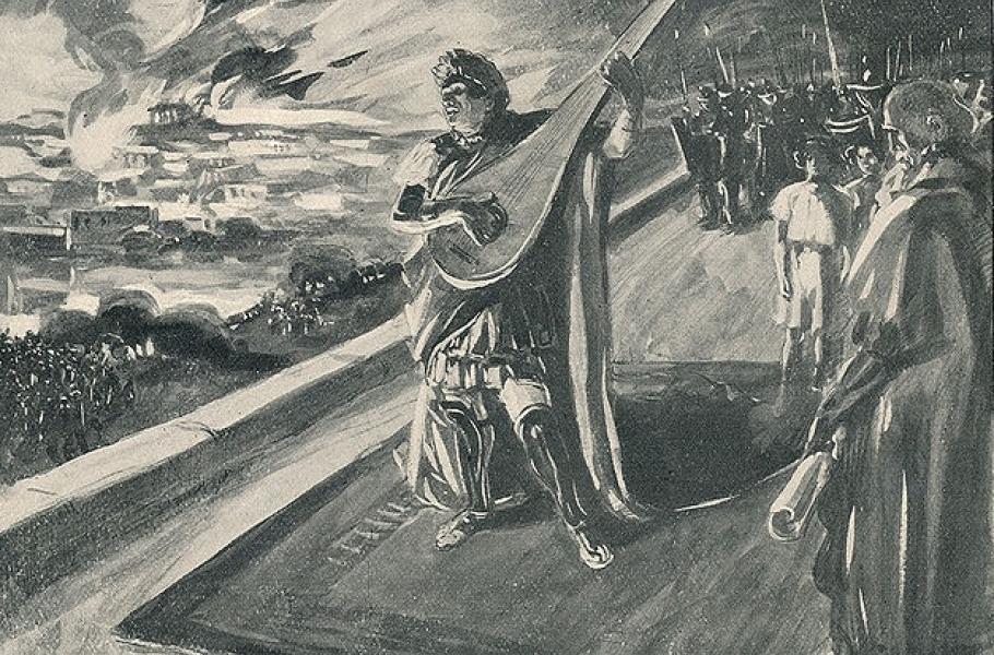 Během požáru recitoval Nero o dobývání Tróje, slavného města, do něhož princ Paris unesl Helenu, nejkrásnější ženu Řecka