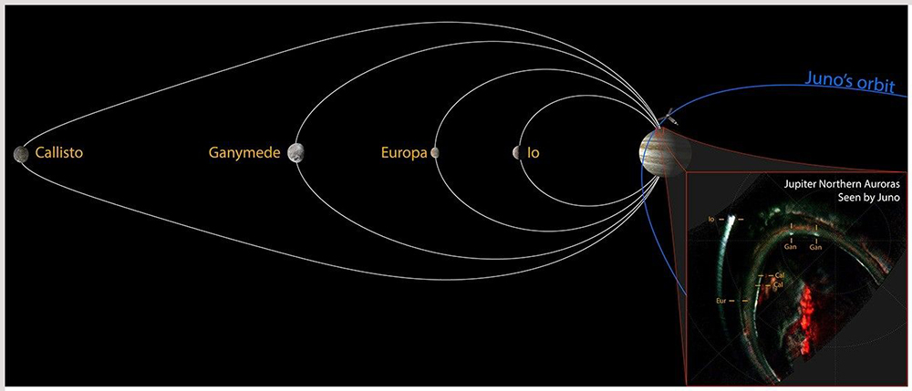 Kromě těchto klasických polárních září ale na Jupiteru existují i polární záře, které mají „na svědomí“ čtyři galileovské měsíce – Io, Europa, Ganymedes a Callisto. Tito Jupiterovi souputníci „brázdí“ jeho magnetické pole, které se otáčí mnohem rychleji, než je rychlost pohybu jednotlivých měsíců. Vzniká tím elektrický náboj a takto nabité částice putují po magnetických siločarách zpět k Jupiteru, kde zasáhnou jeho atmosféru a vyvolávají polární záři.