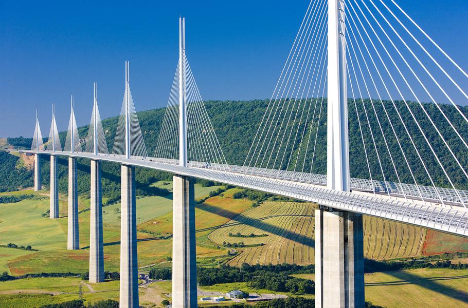 Dva a půl kilometru dlouhý francouzský dálniční most Millau Viaduct vyniká ve dvou ohledech: výškou a krásou. Nejvyšší z celkem sedmi pilířů měří 343 metrů (více než Eiffelova věž) a vozovka převyšuje nejnižší bod údolí o 270 metrů. Na stavbu bylo potřeba 85 tisíc kubíků betonu, slavnostního otevření se most dočkal na sklonu roku 2004. Brzy se stal pro svou ladnost vyhledávanou turistickou atrakcí a bývá považován za jeden z nejvýraznějších inženýrských počinů historie. (foto: Shutterstock)