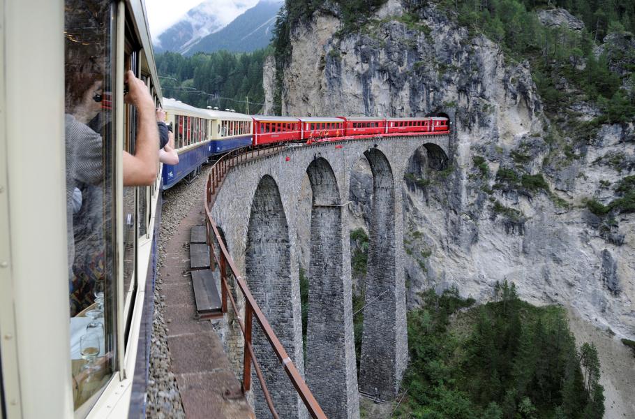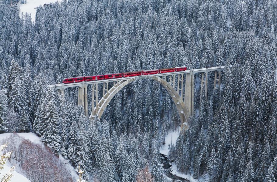 Landwasserský viadukt je jednokolejný šestiklenbový zakřivený železniční viadukt, který se vine nad švýcarskou říčkou Landwasser a spojuje zastávky Alvaneu a Filisur. Na své jihovýchodní straně ústí do 216 metrů dlouhého Landwasserského tunelu. Viadukt navrhl Alexander Acatos a v letech 1901 až 1902 jej postavila firma Müller & Zeerleder. Stavba, která se nachází ve výšce přes tisíc metrů nad mořem, je 65 metrů vysoká a na délku měří 136 metrů. Od roku 2008 je viadukt součástí kulturního dědictví UNESCO. (foto: Profimedia)