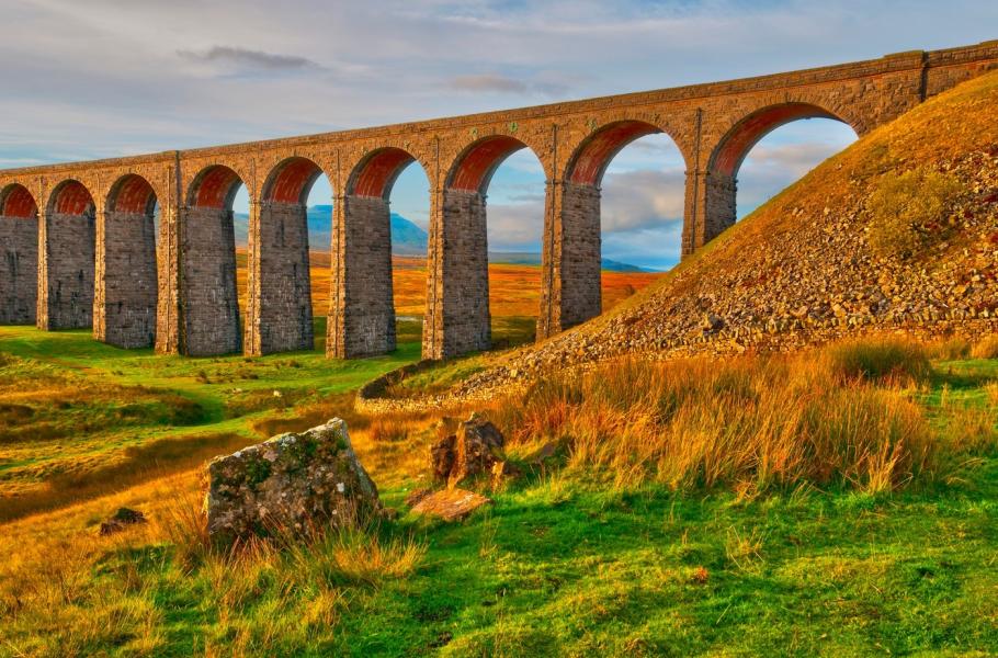 Cestu Harryho Pottera do čarodějné školy v Bradavicích připomíná anglický viadukt Ribblehead. Je 400 metrů dlouhý a najdete ho v Severním Yorkshiru zhruba 45 kilometrů na severozápad od města Skipton. Přestože se po něm první vlaky proháněly již v roce 1876, dodnes je stále v provozu. Před 40 lety měla trať namále - její provozovatel British Rail navrhoval její zrušení. Proti nápadu se ale postavila veřejnost a trať byla alespoň z části zachována. (foto: Profimedia)
