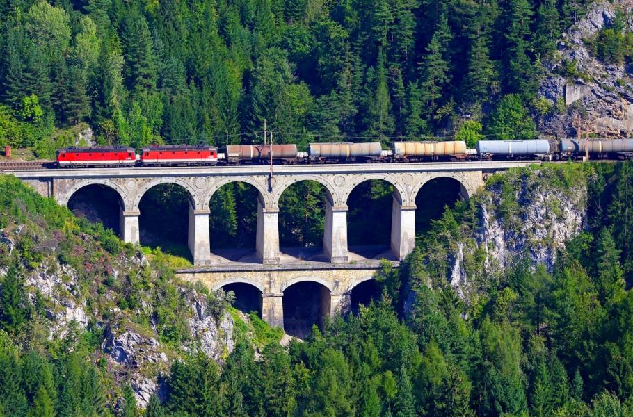 Na horské železniční trati Semmering v Rakousku, která je v provozu už více než 160 let a která je od roku 1998 zapsaná na seznamu UNESCO, je více než stovka mostů a celkem 16 viaduktů. Jedním z těch nejkrásnějších je dvoupatrový viadukt Krausel-Klause. Viadukt je dlouhý 87 metrů, do výšky měří 36 metrů. (foto: Profimedia)