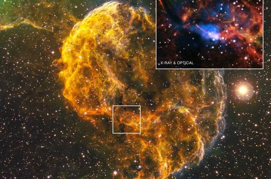 Mlhovina Medúza, známá také jako IC 443, je pozůstatkem supernovy, která explodovala někdy před 30 tisíci lety. Uvnitř této nádherné mlhoviny vědci objevili rychle rotující neutronovou hvězdu - neboli pulsar. Tato hvězda specifických vlastností je jasně patrná ve výřezu složeném z obrazů rentgenového a viditelného spektra.