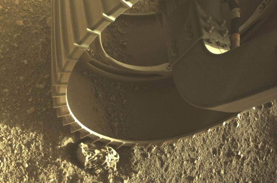 Snímek jednoho z šestice kol roveru Perseverance pořízený pomocí Hazcam. Oproti svému předchůdci Curiosity má nový rover kola, která by měla být podstatně „trvanlivější“.