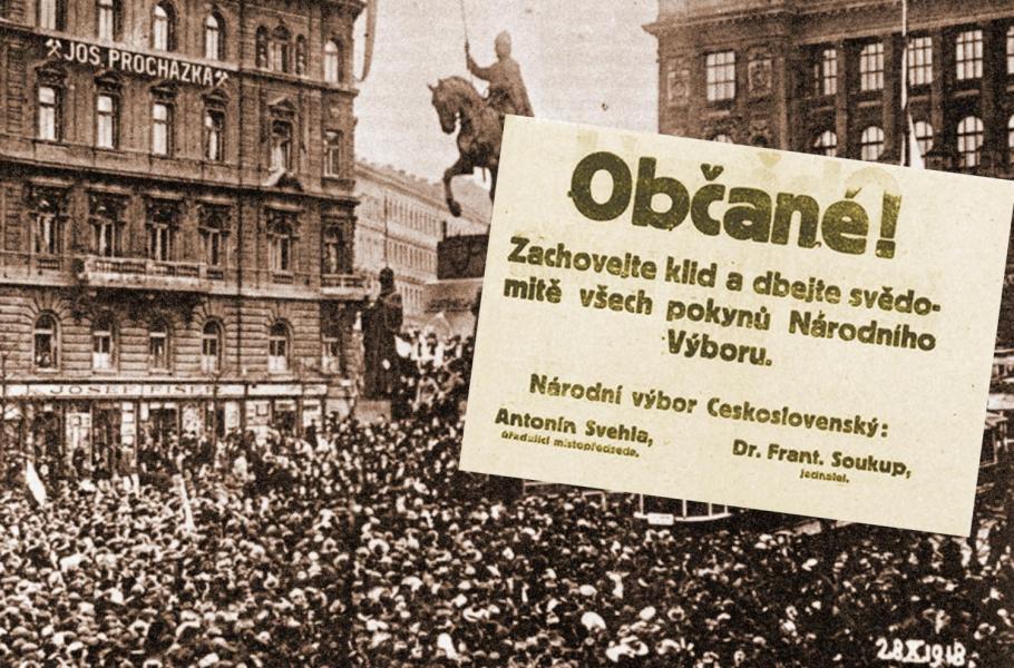Václavské náměstí v průběhu 28. října 1918 a výzva Švehly a Soukupa k zachování klidu.
