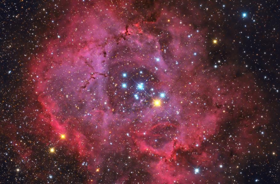 V nitru této překrásné emisní mlhoviny se nachází otevřená hvězdokupa NGC 2244, tvořená jasnými, přibližně čtyři miliony let starými stálicemi. Okolní svit má na svědomí ultrafialové záření z těchto horkých hvězd. Růžicová mlhovina měří asi 100 světelných roků a nachází se zhruba 5 000 světelných let od Země v souhvězdí Jednorožce. Hmotnost mlhoviny se odhaduje na přibližně 10 000 hmotností Slunce.