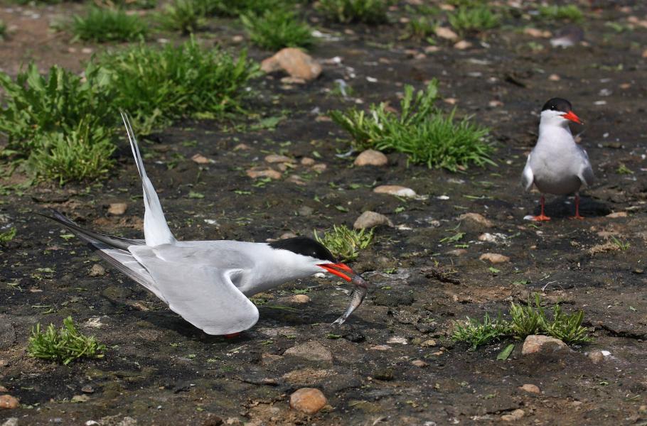 Samička chvíli váhá. V okamžiku, kdy se rozhodne dar přijmout, jí ovšem sameček, který jako by si svůj záměr rozmyslel, s nabízenou rybičkou odlétne. Samička jej následuje a po chvilce dojde k předání rybky během letu. Partneři pak společně létají nad kolonií.