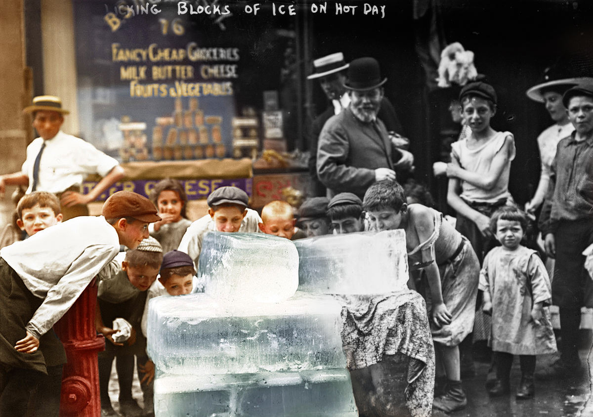 Během vlny veder se dalo na ulici osvěžit i lízáním ledových kvádrů (New York roku 1912, foto: Library of Congress)