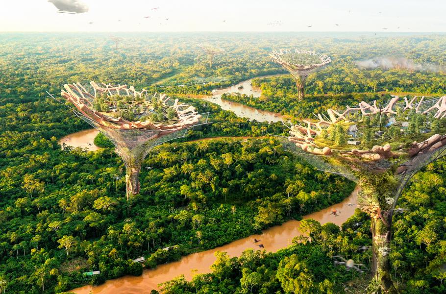 Mrakodrapy podobné stromům by měly podle skupiny německých inženýrů vyrůst v povodí Amazonky. Nabídly by nejen ubytování lidem, ale hlavně by posloužily řadě živočišných druhů coby útočiště nebo třeba jako rezervoáry vody. (zdroj: Skyscraper Competition)