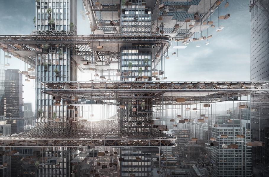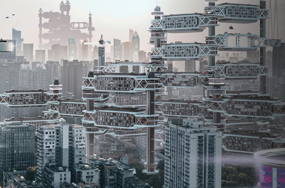 Čínští architekti se zaměřili i na nevyužitý prostor kolem výškových budov. Navrhují mezi nimi vztyčit platformy, které by mrakodrapy nejen spojovaly, ale zároveň by nabídly relaxační a obytné zóny, a ulevily tak zástavbě na zemi. (zdroj: Skyscraper Competition)