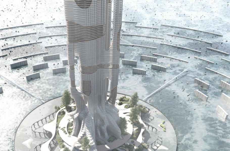 Mrakodrap budoucnosti navrhli autoři tak, aby pomohl s čištěním oceánů. V jeho podvodní základně se ukrývá obrovský filtr, zachytává částečky plastů a přetváří je na stavební materiál, z nějž pak vyrůstá samotná budova. Kolos navíc není ukotvený, ale spočívá na umělém ostrově, takže se může přesouvat. Věž by měla být zcela stabilní: Část pod hladinou je stejně masivní jako ta nad ní. (zdroj: Skyscraper Competition)