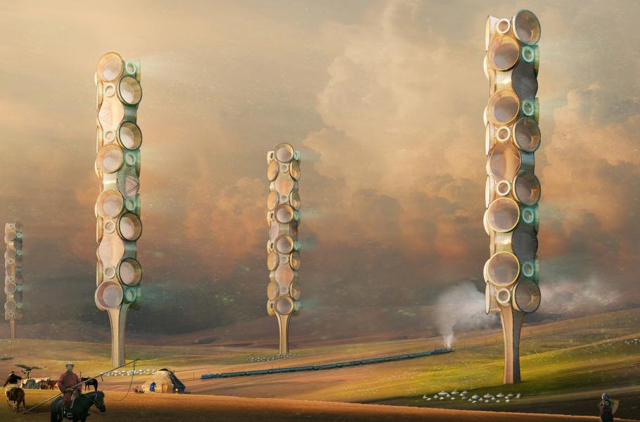 Futuristicky vyhlížející věže jsou navrženy pro boj s rozšiřováním mongolské pouště. Díky tzv. Lavalovým dýzám, které jinak nacházejí uplatnění ve vyústění tryskových motorů, mohou zesilovat proudění větru a pomocí získané energie pak vysévat rostliny až do okruhu jednoho kilometru. (zdroj: Skyscraper Competition)