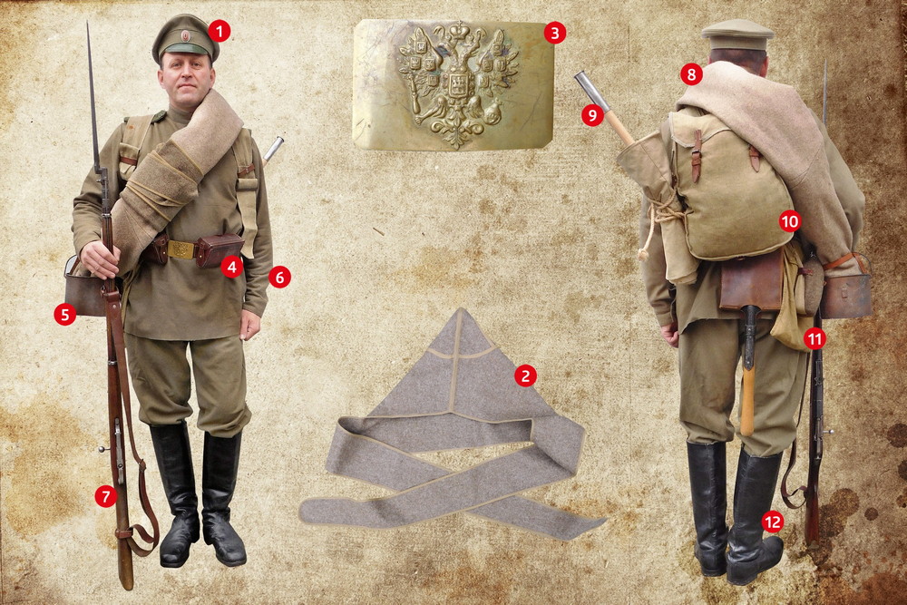 - Soukenná čepice (Pochodnaja furažka, vzor 1907) s koženým štítkem v barvě stejnokroje nese kovovou kokardu vymalovanou v romanovských barvách.