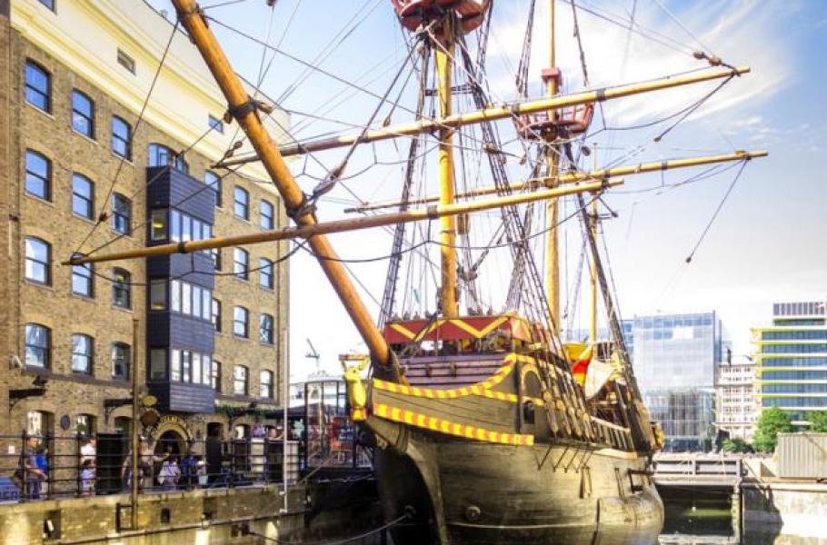 Slavná galeona anglického korzára Francise Drakea se původně jmenovala Pelican, během své plavby kolem zeměkoule v letech 1577–1580 ji však proslulý mořeplavec překřtil na Golden Hind (v překladu „zlatá laň“). Plachetnice, jejíž výstavbu financovala i královna Alžběta I., byla poprvé spuštěna na vodu roku 1570. Replika v původním měřítku pak vznikala od roku 1973 v Appledore v Severním Devonu. V následujících letech loď procestovala celý svět, přičemž překonala víc než 140 000 km. V roce 1992 se vrátila do Velké Británie a od roku 1996 je k vidění u břehů Temže.
