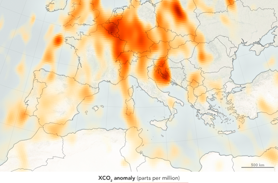Měření satelitu OCO-2 ukazují místa s anomálně vysokým obsahem oxidu uhličitého nad Evropou