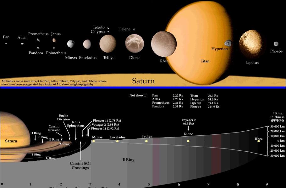 Největším měsícem planety a druhým největším ve Sluneční soustavě je Titan. Jako jediný má také hustou atmosféru a mohl by na něm existovat i život. Ale i další měsíce z rozsáhlé Saturnovy rodiny jsou velmi zajímavé. Druhý největší, Rhea, je možná obklopen vlastním řídkým trojitým prstencem, jak naznačují některá měření chování energetických elektronů uvězněných v silném magnetickém poli planety. Přístroje sondy Cassini nejsou dostatečně citlivé, aby mohly v blízké době poskytnout definitivní odpověď – odborníci proto odhadují, že částice tvořící hypotetický prstenec nejsou větší než milimetr, a jde tudíž nejspíš o prach.