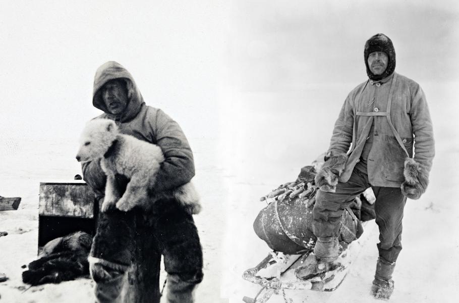 Roald Amundsen (vlevo) zajistil pro svou skupinu zvířecí kožešiny, jež chránily proti větru, dobře držely teplo a přirozeně větraly. Robert Falcon Scott (vpravo) a jeho muži navlékli mnoho bavlněných vrstev, pod nimiž nosili vlnu. Ta ale neodváděla pot, který na těle namrzal.