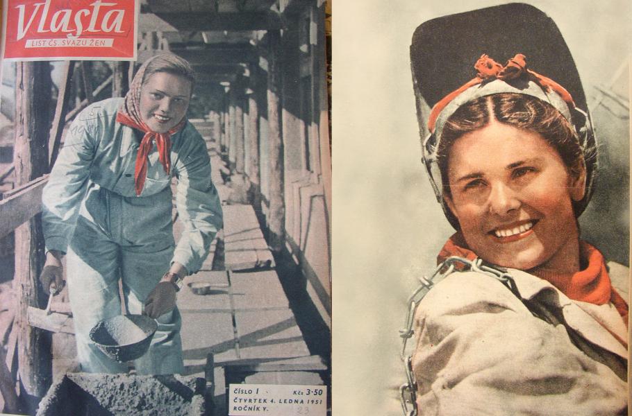 Svářečka na obálce časopisu Vlasta z roku 1955 je kolorována tak, aby měla jak ženskou krásu, tak prezentovala komunistické budovatelské úsilí.