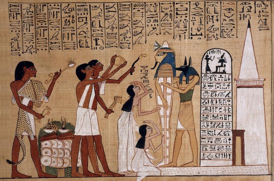 Rituál otvírání úst – rakev s mumií symbolicky třímá sám Anup (Anúbis), dcera a manželka mrtvého faraona hořekují, zatímco kněží vykonávají obřady.