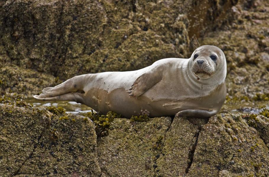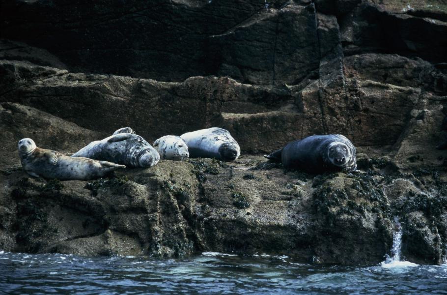 Tuleni kuželozubí (Halichoerus grypus) se vyhřívají se na skaliscích obnažených odlivem.