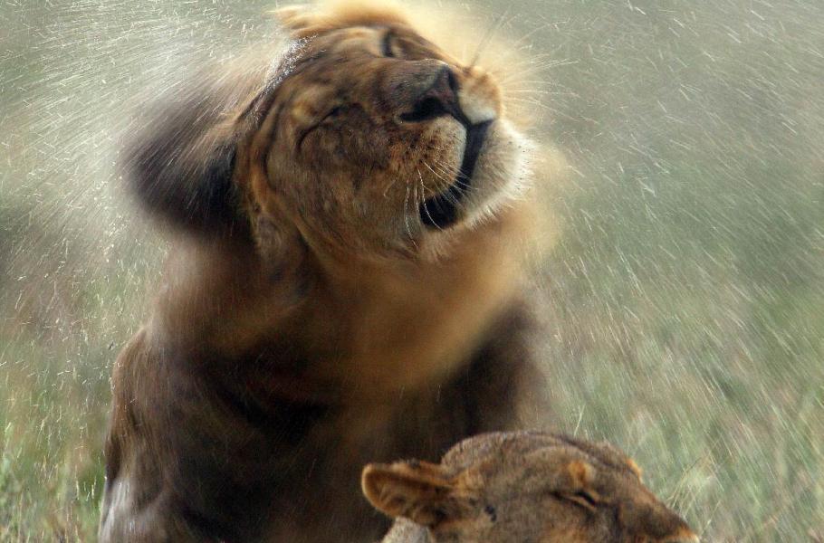 Lev se zmocnil lvice a řve u toho, až mi běhá mráz po zádech! Na vlastní oči vidím to nádherné divadlo, ještě přiblížené teleobjektivem. Tyhle okamžiky chci mít samozřejmě zaznamenané, a tak zpočátku bezhlavě mačkám spoušť. Teprve po několika chvílích se mi do hlavy vrací něco jako klid. Během několika vteřin je po představení a lvice zůstává ležet v trávě. Ve skle teleobjektivu zřetelně vidím kapky deště a napadá mě, co kdybych nastavil delší expozici… Lvi se po chvíli znovu páří, což se v období říjnosti samic děje i padesátkrát denně! Tenhle milostný akt je ještě kratší než předešlý a lev si sedá za lvici. Prší opravdu hodně. Lev najednou natáčí hlavu ke straně a já už vím, co bude následovat.