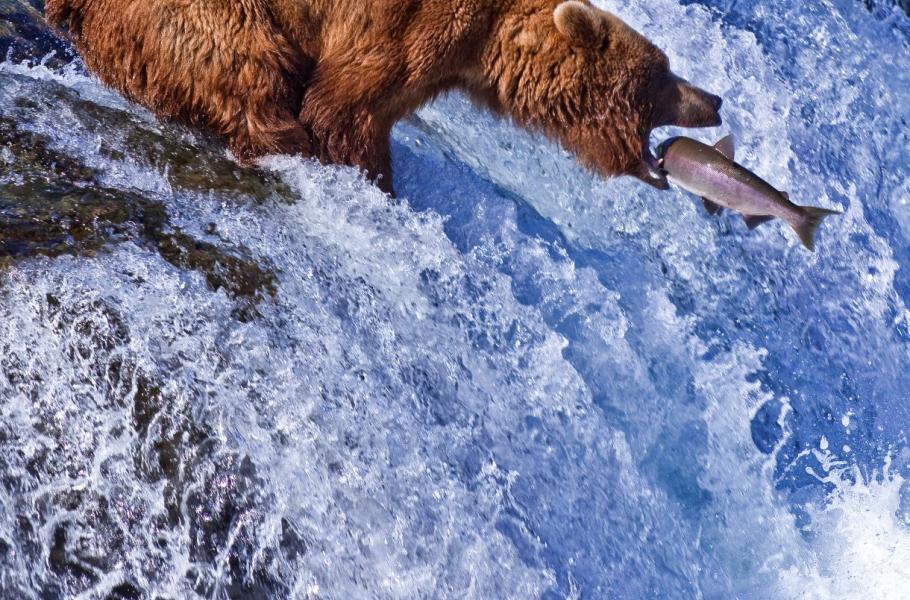 Medvědi mají vysoké teritoriální nároky a na svém území nesnášejí konkurenci. K mnoha konfliktům mezi těmito mocnými predátory proto dochází v Národním parku Katmai ve dvou vrcholech tahu lososů – v červnu a září. Na relativně malém území se zde v této době soustřeďuje až neuvěřitelných šedesát medvědů grizzly. (foto: Shutterstock)