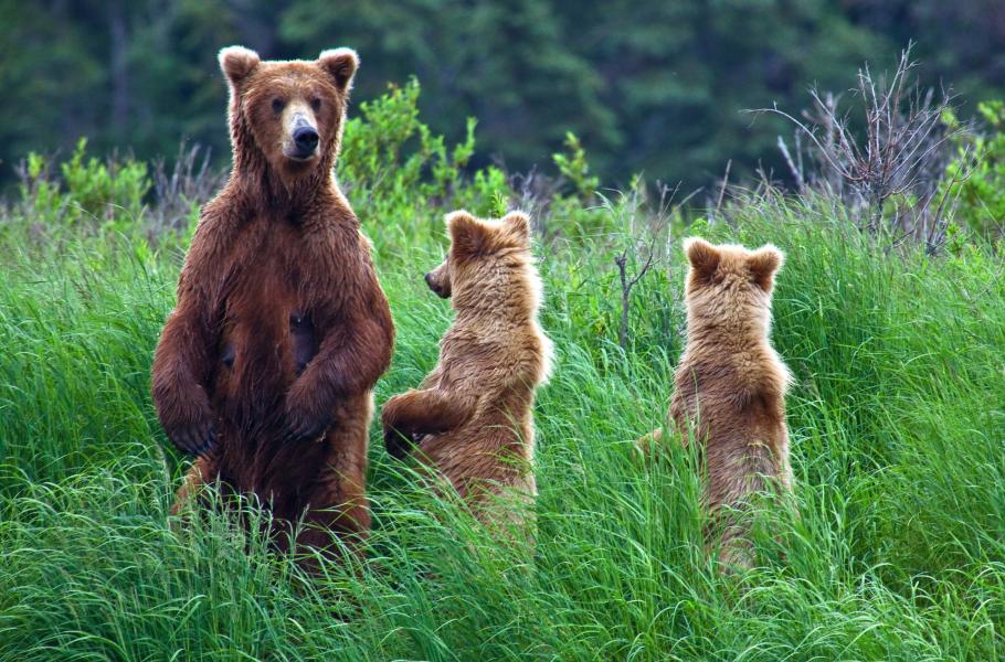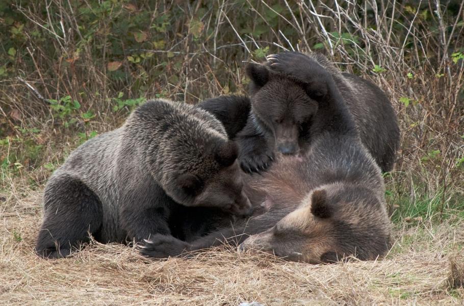 Medvědi žijí samotářsky, pouze v době rozmnožování (často samci o samice tvrdě bojují) se schází a tráví spolu několik dní. Po společném páření samice samce odežene a opět začínají žít odděleně. Mláďata grizzlyho přicházejí na svět v brlohu přes zimní měsíce, mezi lednem a únorem, a váží necelého půl kila. Matka kojí a vytváří energii z posledních tukových zásob, které předchozího roku nashromáždila. Do jara ztratí až třetinu původní hmotnosti. (foto: Shutterstock)