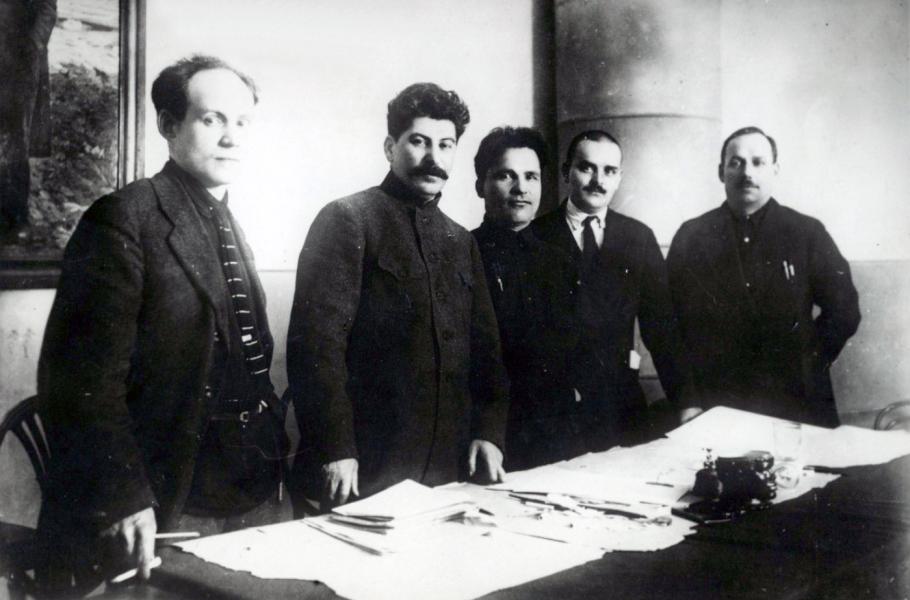 Nikolaj Antipov, Josif Stalin, Sergej Kirov, Nikolaj Švernik a Nikolaj Komarov, Leningrad 1926. Antipov a Komarov byli popraveni během Velkého teroru. Pouze Švernik a Stalin zemřeli přirozenou smrtí. (foto: Wikimedia Commons, PDM 1.0)