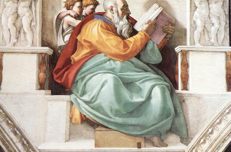 Desátého května 1508 vylezl v kapli poprvé na lešení a začal malovat dvanáct apoštolů a ornamentální dekorace, podle papežova přání. Nebavilo ho to, a proto taky dlouho nevydržel: Jednoho dne seškrábal, co vytvořil, a předložil hlavě církve vlastní návrh připomínající – slovy historika umění Heinricha Wölfflina – „hřmící zjevení nové moci“.