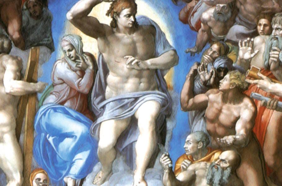 Po odhalení fresky 31. října 1541 sklidila opravdu velkou kritiku především postava Krista: Chyběly jí vousy, byla nepřiměřeně mladého vzhledu a především postrádala důstojnost. Svalnatým tělem, dokonalými rysy obličeje a rozcuchanými vlnitými vlasy Spasitel skutečně připomíná spíš některého z dvaceti ignudů, nahých mužských postav, jimiž je dílo poseto. Vznáší se na mračném trůnu obklopen žlutozlatou aureolou a oděn do světle šedého pláště, který jeho tělo víc odhaluje, než halí. Pohled upírá k peklu, zatímco Panna Marie, sedící po jeho boku, pohlíží ke spaseným.
