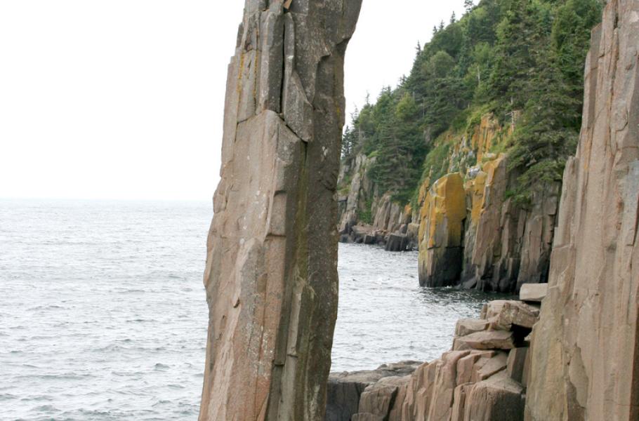 Vysoký a štíhlý čedičový sloup stojí na pobřeží Nového Skotska poblíž města Digby. Přežil na tomto místě nejen sílu bouří, ale také zápolení zdejších rybářů, kteří se snažili zvolit toho nejsilnějšího, jenž by sloup dokázal svalit do moře. Kamenný strážce vln tak trpěl jen vinou turistů, kteří do něj a do okolních skal ještě nedávno bezostyšně ryli svoje vzkazy. (foto: Shutterstock)