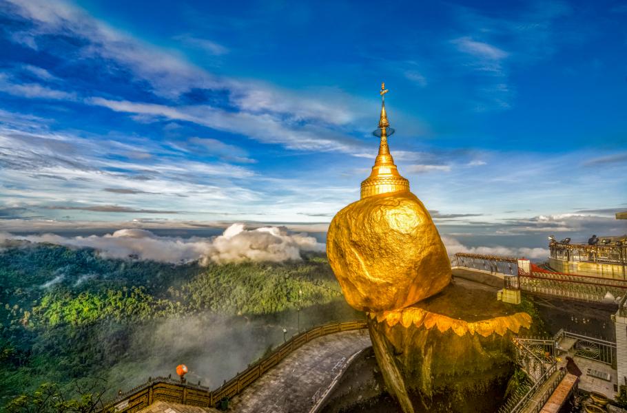 Podle legendy drží Zlatý kámen (Kyaik-htiyo) v myanmarském Rangúnu na svém místě díky jedinému vlasu Buddhy. Každopádně se jedná o posvátnou lokalitu: na vrcholku viklanu vznikla i malá pagoda a celý skalní útvar pokryly lístky zlata. (foto: Shutterstock)