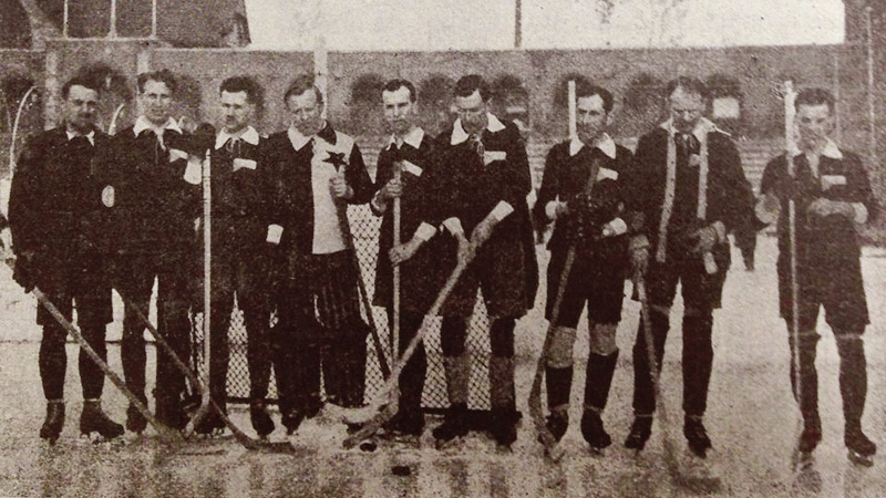 Čeští hokejisté jako mistři Evropy 1914 v Berlíně. Zleva: V. Pondělníček, J. Fleischmann, K. Pešek, F. Rublič, J. Jirkovský, K. Wälzer, J. Páral, J. Palouš. (foto: Wikimedia Commons, CC0)